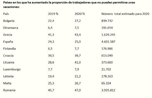 Rumanía, Grecia y Lituania son los Estados con mayor número de personas empleadas que no pueden ausentarse durante una semana. Italia (8 millones), España (4,6 millones) y Francia (4,1 millones) son los países con mayor número de trabajadores y trabajadoras que se quedan sin vacaciones por motivos económicos.