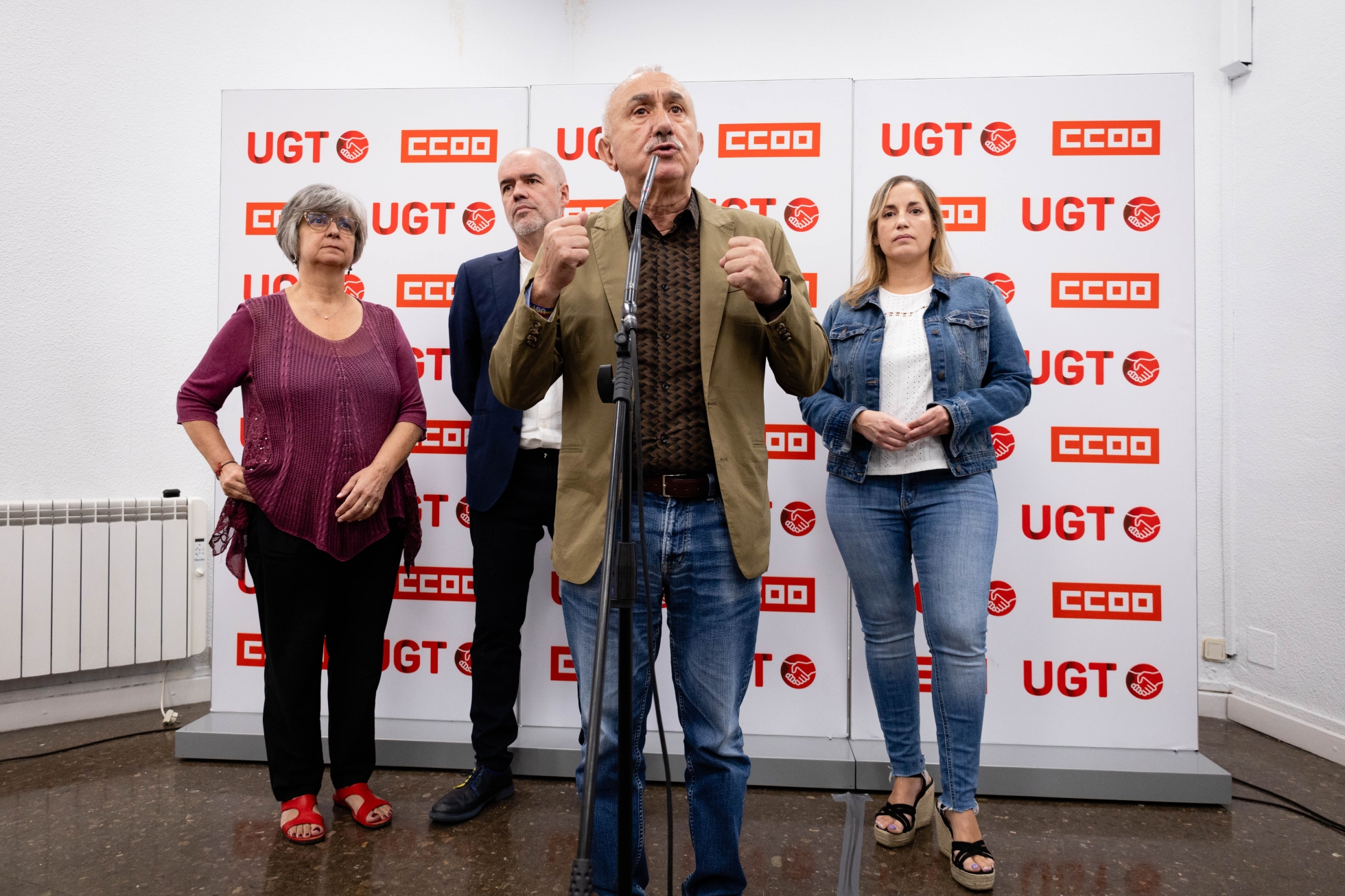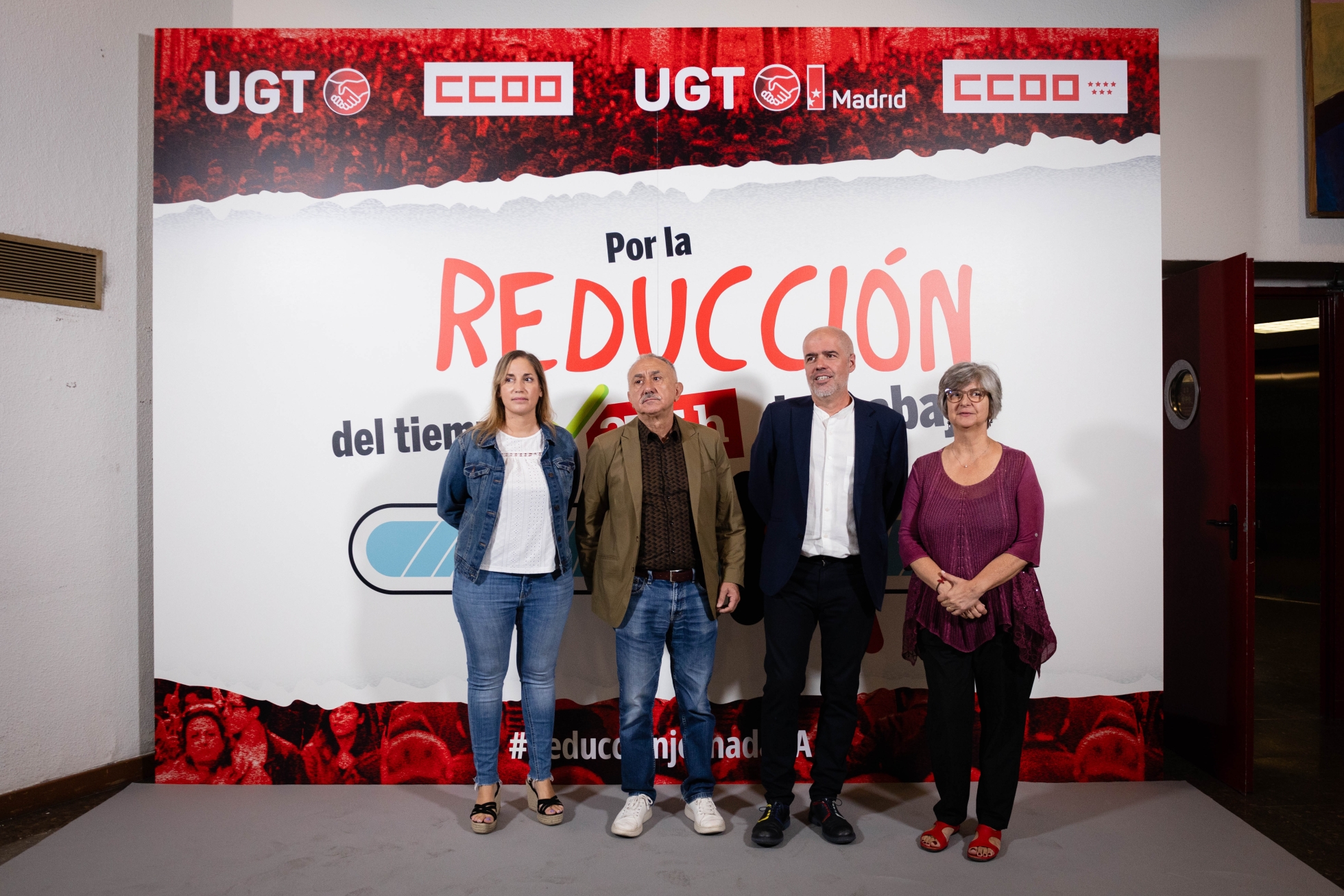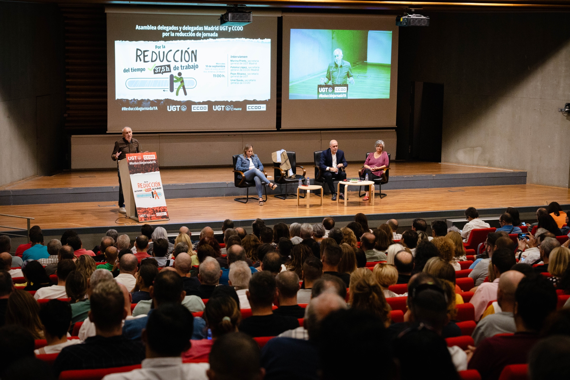 Asamblea de delegados y delegadas de Madrid UGT y CCOO por la reducción de jornada Madrid, 18 de septiembre de 2024 Los secretarios generales de UGT y CCOO atienden a medios Pepe Álvarez en la atención a medios Los y las representantes sindicales posan en el photocall Marina Prieto, secretaria general de UGT Madrid Paloma López Bermejo, secretaria general de CCOO Madrid Pepe Álvarez y Unai Sordo intercambian unas palabras Pepe Álvarez, secretario general de UGT Álvarez habla sobre la reducción de la jornada laboral Unai Sordo, secretario general de CCOO Los y las ponentes posan en el auditorio Pincha aquí para ver todas las imágenes de la asamblea