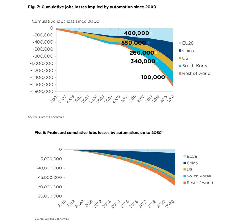 El estudio How Robots Change the World, confeccionado por Oxford Economics, vuelve a demostrar la relación directa entre roborización y desempleo, que se cifra en casi dos personas que pierden su empleo por cada robot que entra en la industria manufacturera. Estas conclusiones son coherentes y van en la misma línea de estudios anteriores (Bruegel, Acemoglu y Restrepo).