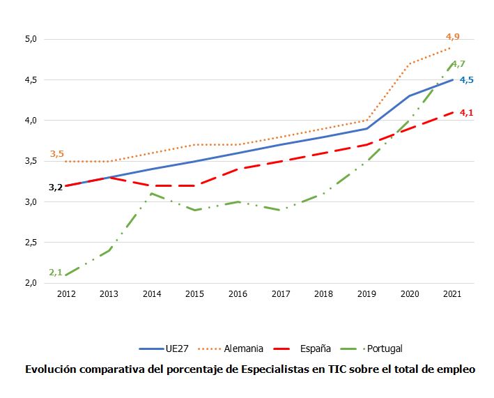 Actualmente, España se sitúa en el puesto 19 de los 30 países analizados (17 dentro de la UE27), con un 4,1% de especialistas en TIC sobre el total de empleo (el líder europeo, Suecia, nos dobla en porcentaje). Economías de menor peso e importancia en el contexto europeo nos superan abiertamente: Países Bajos se aproxima a 7%; Irlanda supera el 6%; y Malta está en el 5%.