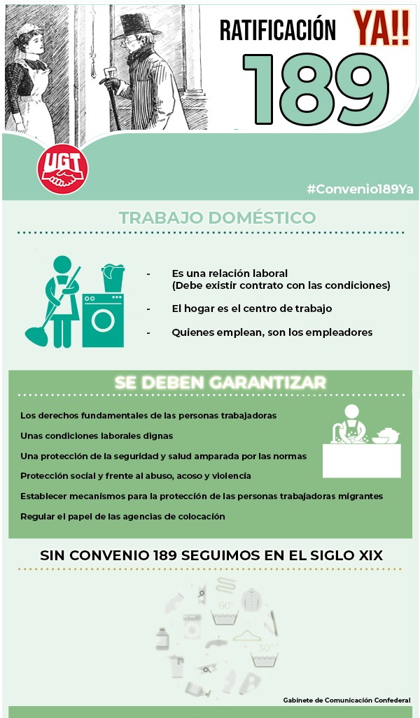 UGT lleva reclamando desde entonces que España ratifique lo antes posible el Convenio 189 de la OIT para dignificar el empleo del sector puesto que España es el segundo de la UE con más trabajo doméstico, un empleo muy feminizado y precarizado.