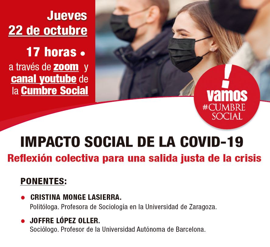 La Cumbre Social Estatal ha organizado un Encuentro Virtual para analizar el impacto social de la Covid-19 “Una reflexión colectiva para una salida justa de la crisis” en el que participarán Cristina Monge, politóloga y profesora de Sociología en la Universidad de Zaragoza y Jofre López Oller, Sociólogo y profesor de la Universidad Autónoma de Barcelona.