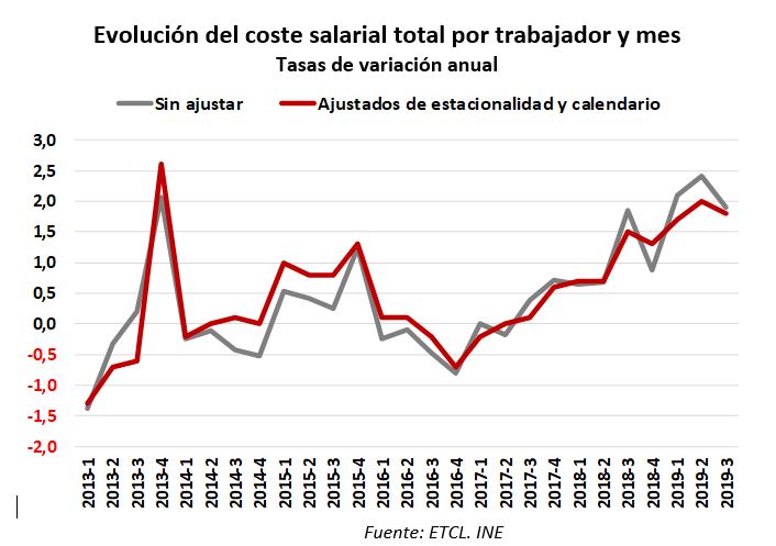 Los datos de la Encuesta Trimestral de Coste Laboral del tercer trimestre de 2019, publicados hoy por el INE, reflejan un relativo mantenimiento de la evolución mostrada por los salarios en este año 2019. El coste laboral total por trabajador y mes creció un 2,2% respecto al mismo trimestre del año anterior, y el coste estrictamente salarial, un 1,9%. Aunque en ambos casos se trata de dos décimas menos que en el trimestre anterior, permanecen en el entorno de variación mostrado a lo largo del año, cercano al 2%, tras años de estancamiento o caída (de 2010 a 2017 la media de incremento anual de los costes laborales y salariales ha sido, respectivamente, del 0,2% y del 0,3%).