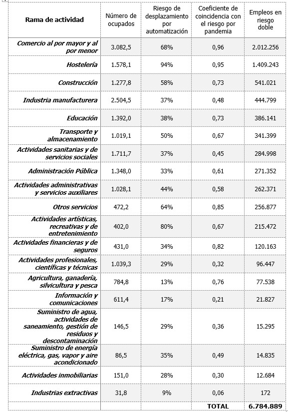 La transposición de esta metodología a España, confrontándola con la EPA, muestra un panorama inquietante: hasta siete millones de empleos estarían amenazados en la próxima década por los efectos de esta pandemia, y a la vez, corren el riesgo de ser reemplazados por máquinas. La distribución de nuestro tejido productivo, excesivamente focalizado en los sectores más indefensos a ambas casuísticas (efectos de la pandemia y riesgo de automatización), como la hostelería, el comercio al por mayor/menor o la construcción, hacen que el efecto sea mucho más acusado en nuestro país que en el resto de Europa.