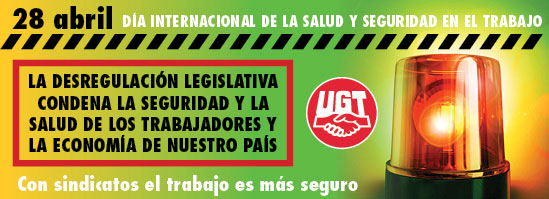 UGT ha editado el cartel y el díptico con motivo de la conmemoración, el próximo lunes, 28 de abril, del Día Internacional de la Salud y la Seguridad en el Trabajo que este año se celebra bajo el lema “La desregulación legislativa condena la seguridad y la salud de los trabajadores y la economía de nuestro país. Con sindicatos, el trabajo es más seguro”.