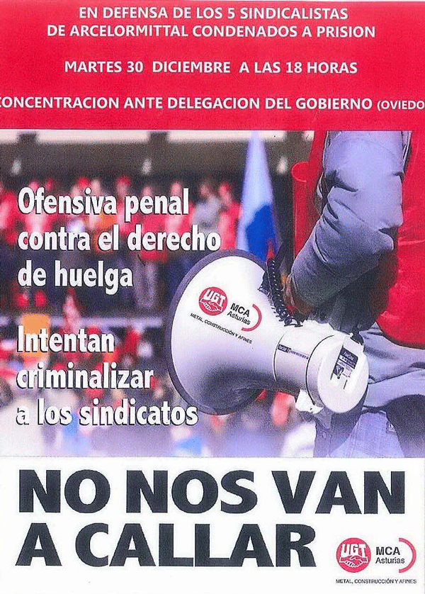 "El día 5 de Diciembre de 2014, se ha dictado una SENTENCIA INJUSTA, condenando a cinco compañeros de MCA-UGT, por unos sucesos ocurridos el 29 de Marzo de 2012 durante el transcurso de la Huelga General en el interior de la Factoría de ArcelorMittal en Veriña-Gijón.