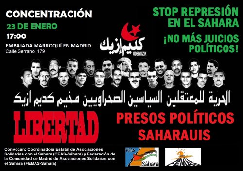 UGT apoya la concentración que tendrá lugar el próximo lunes ,23 de enero, para expresar su preocupación ante el juicio que se celebrará en Rabat contra 24 saharauis que fueron detenidos por las autoridades de Marruecos durante el desmantelamiento del campamento de Gdeim Izik al sur de El Aaiún, el 8 de noviembre de 2010.