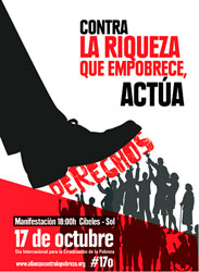 La Alianza Española contra la Pobreza y la Cumbre Social, de la que UGT forma parte, han hecho un llamamiento a participar en las más de 30 movilizaciones que se desarrollarán el viernes, 17 de octubre, con motivo del Día Internacional para la Erradicación de la Pobreza. Los convocantes protestan contra un sistema que permite el enriquecimiento ilimitado de una minoría a costa del empobrecimiento de millones de personas y exigen que se garanticen los derechos humanos, políticas fiscales justas y redistributivas y el fin de la economía especulativa.