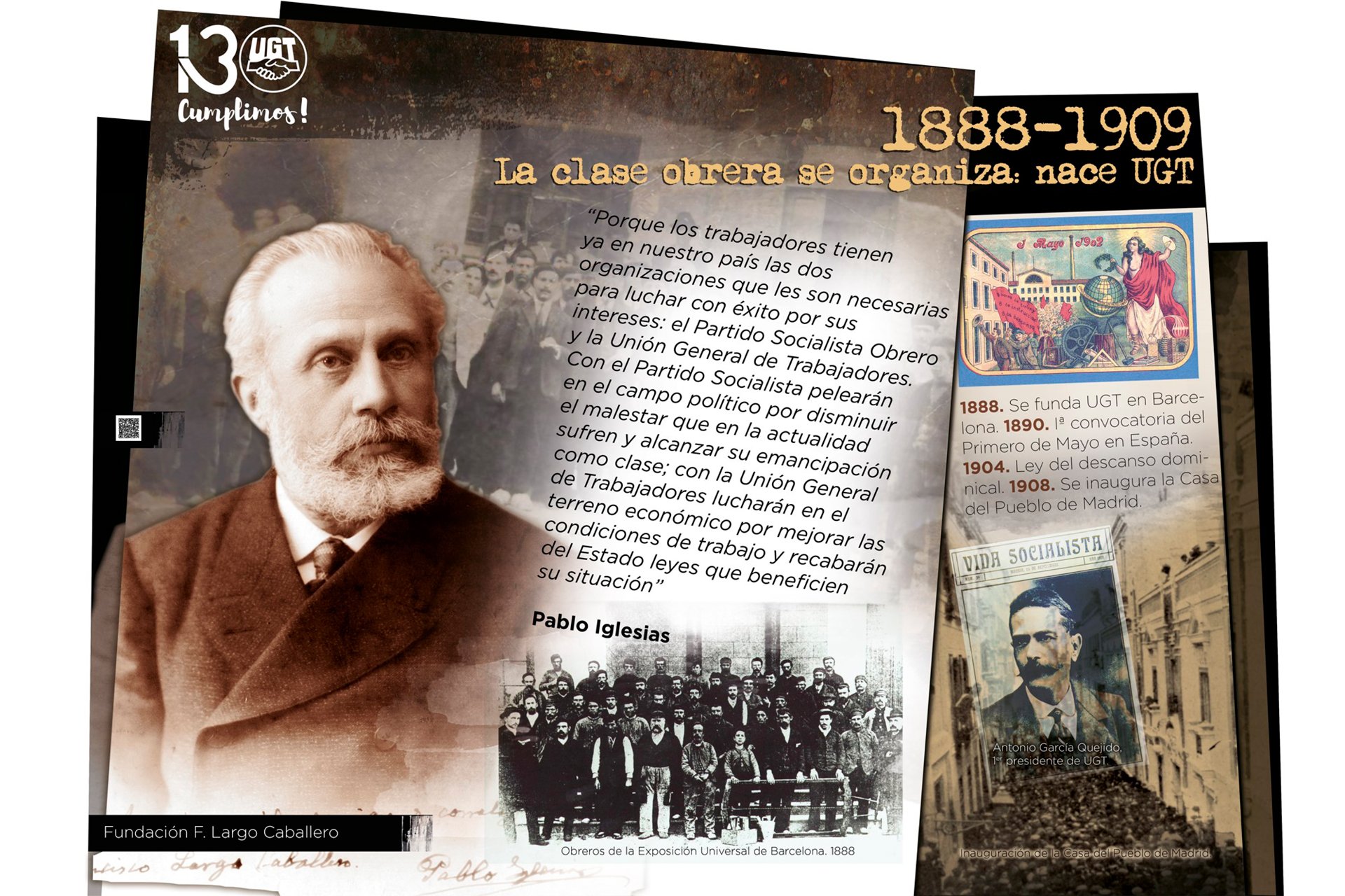 La Secretaria de Política Social de UGT-Catalunya, Enriqueta Durán, ha sido la encargada de hacer la presentación de la Primera Exposición histórica “130 años de luchas y conquistas”, compuesta por 20 paneles de los que 14 son cronológicos, y recogen los hitos más importantes del recorrido vital del sindicato, y seis son paneles temáticos que recogen los grandes logros impulsados por UGT y que han contribuido a transformar y mejorar la vida de los trabajadores y trabajadoras a través de tres siglos diferentes