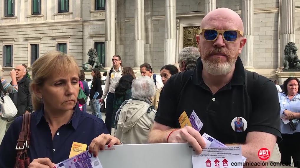 Jesús Gallego, Secretario de Internacional y Adela Carrió, Secretaria Confederal de UGT, frente al Congreso de los Diputados para denunciar situación y escenificar causas de la pobreza y la desigualdad y durante la entrega de un manifiesto a los miembros de los Comisión de Presupuestos de la Cámara Baja.
