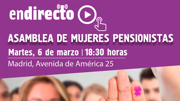 UGT y CCOO celebran hoy martes, 6 de marzo, una Asamblea conjunta de mujeres pensionistas en la que intervendrán los Secretarios Generales de UGT y CCOO, Pepe Álvarez y Unai Sordo, la Vicesecretaria General de UGT, Cristina Antoñanzas, la Secretaria de Mujeres e Igualdad, Elena Blasco.
