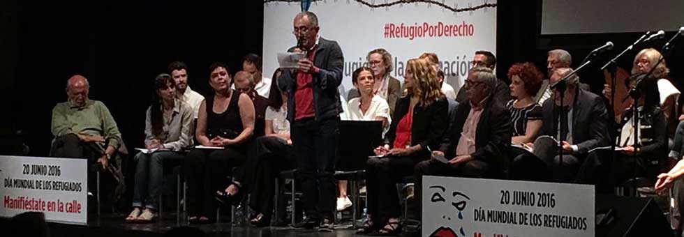 El acto de la sociedad y la cultura, bajo el lema SOS Refugiados ha sido conducido por Almudena Grandes, el Gran Wyoming y Carlos Olalla y en él que han participado escritores, periodistas, actrices, actores, músicos, sindicalistas, representantes políticos, intelectuales. Muchos de ellos han dado testimonio con su voz de casos concretos de refugiados procedentes de distintos países. Refugiados con nombre y apellido, refugiados anónimos. Otros participantes en el acto han reclamado el respeto a los refugiados a través de poemas, exigiendo el cumplimiento de la Declaración Universal de Derechos Humanos, el artículo 2 del Tratado de la UE o el artículo 78 del Tratado del Funcionamiento de la UE. Normas que hablan de los derechos de las personas, del derecho de asilo, de protección internacional, …