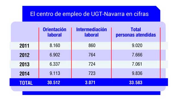 Concretamente, en 2014, el Centro de Empleo de la UGT atendió a 9.836 personas (9.113 recibieron orientación laboral y 723 participaron en acciones de intermediación laboral con empresas), la cifra más alta de todo el periodo.