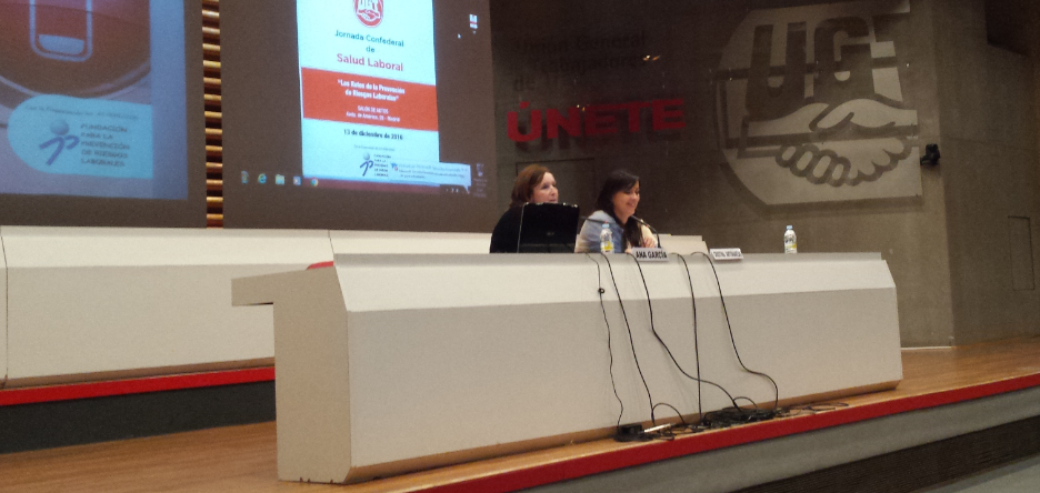 La Vicesecretaria General de UGT, Cristina Antoñanzas, y la Secretaria de Salud Laboral y Medio Ambiente del sindicato, Ana García de la Torre, han participado esta mañana en ña inauguración de la Jornada Confederal de Salud Laboral en la que se han analizado los retos de la prevención de riesgos laborales y se han presentado los trabajos del Observatorio de Riesgos Psicosociales.