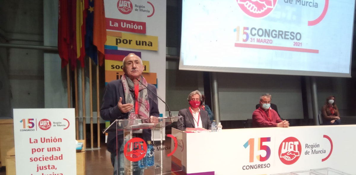 Pepe Álvarez ha realizado estas declaraciones durante el 15 Congreso de UGT-Región de Murcia, que ha reelegido a Antonio Jiménez como nuevo Secretario General de la Unión para los próximos cuatro años, y donde ha estampado su firma en defensa del Mar Menor, iniciativa que está recogiendo firmas para llevar una Proposición de Ley al Congreso.