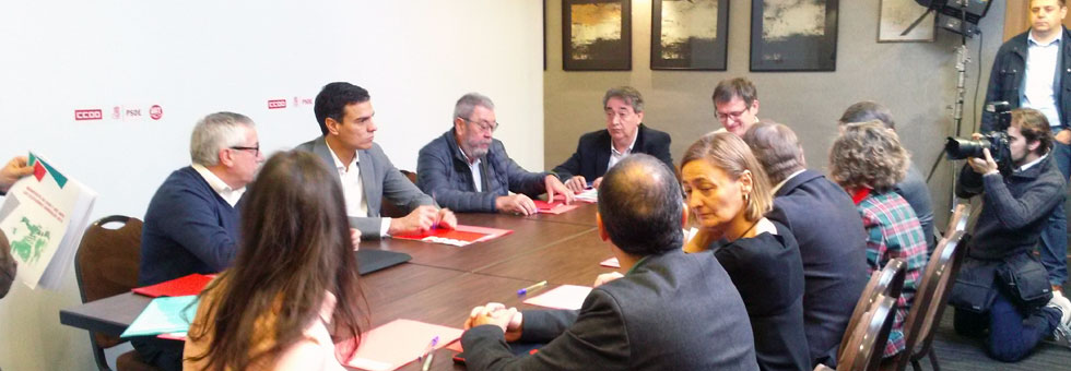 Los Secretarios Generales de UGT y CCOO, Cándido Méndez e Ignacio Fernández Toxo, han mantenido esta mañana una reunión con el Secretario general del PSOE, Pedro Sánchez, para presentarles un manifiesto con las propuestas de ambos sindicatos de cara a las elecciones generales del 20 de diciembre.