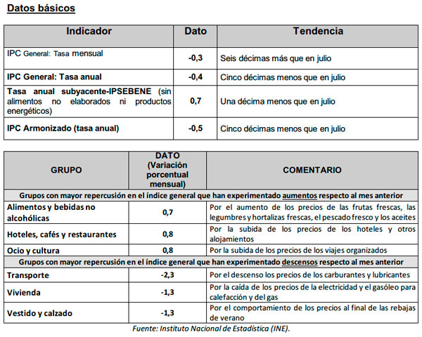 Según los datos publicados hoy por el Instituto Nacional de Estadística (INE), la evolución anual del IPC ha iniciado un nuevo descenso comparado con la estabilidad de los dos meses anteriores, y se sitúa en el -0,4%. Por su parte, la tasa mensual se sitúa en -0,3%%, esto es, seis décimas por encima de la del mes de julio.