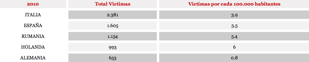 - El mayor número de víctimas en la Unión Europea en el año 2010 eran nacionales de Rumania (1.885), seguido de Bulgaria (718), Francia (189), Alemania (122) y España (109); es decir el 8% de las víctimas identificadas o presuntas en España, tenían nacionalidad española.