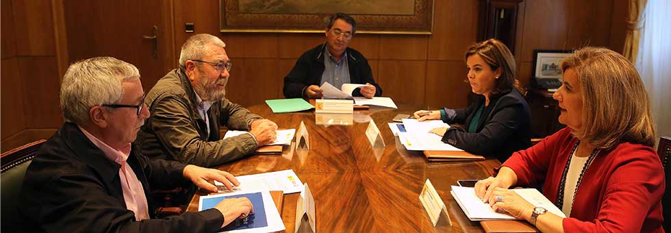 La vicepresidenta del Gobierno, Soraya Sáenz de Santamaría, la ministra de Empleo y Seguridad Social, Fátima Báñez, y los secretarios generales de los sindicatos CCOO, Ignacio Fernández Toxo, y UGT, Cándido Méndez, han mantenido este jueves una reunión en la sede del Ministerio de Empleo y Seguridad Social, para tratar posibles líneas de colaboración en relación con el fomento de la integración laboral de los refugiados en España. La próxima semana tendrá lugar otra reunión con representantes de CEOE y CEPYME.