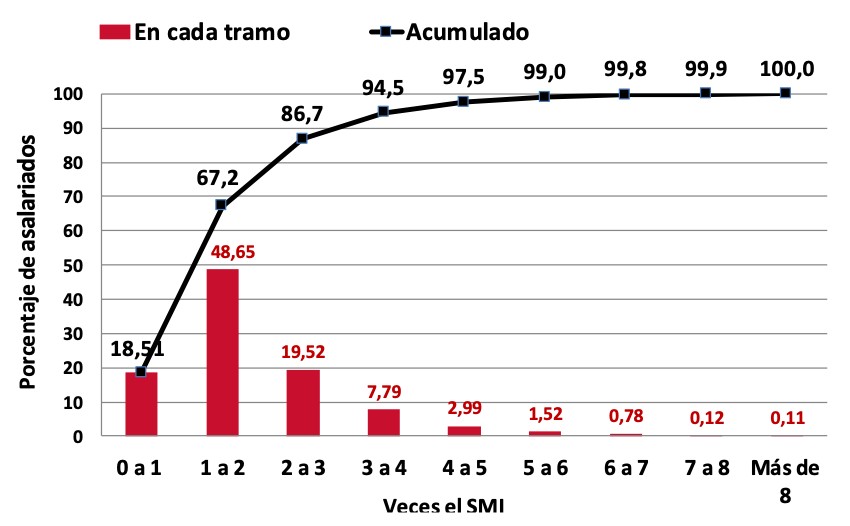 Por otro lado, estos aumentos han ido comprimiendo el abanico salarial, de manera que en 2023 un 18,5% de las personas trabajadoras tenían ingresos anuales por debajo del SMI, esencialmente porque poseían un trabajo a jornada parcial. Este grupo, sumado a aquellos que cobran entre 1 y 2 veces el SMI (48,7%) supone el 67,2% del total de personas asalariadas (dos de cada tres). Por eso, además de continuar aumentado el SMI, es igualmente importante es que los salarios de convenio crezcan adecuadamente para evitar la mencionada compresión del abanico salarial, que está provocando que los salarios bajos se aproximen cada vez más al salario más frecuente en nuestro país.