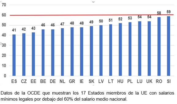 La Unión General de Trabajadores, en consonancia con la Confederación Europea de Sindicatos (CES), reclama la necesidad de que el Salario Mínimo Interprofesional (SMI) vaya alcanzando el 60% del salario medio al final de la Legislatura. Los salarios mínimos legales están dejando a los trabajadores y trabajadoras en riesgo de pobreza en, al menos, 17 Estados miembros de la UE, como señala la OCDE con datos de 2018.