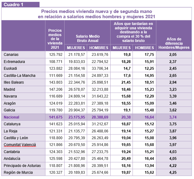 Por Comunidades, Murcia es donde se produce mayor brecha de género en materia de vivienda y la Comunidad de Canarias, donde menor brecha se da (cuadro 1).