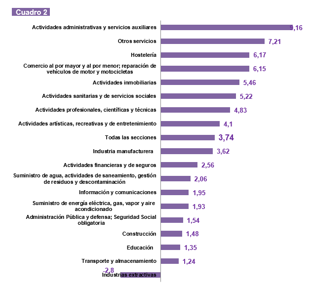 El sector en el trabajamos y la diferencia salarial también influye. Así, la horquilla oscila de 9 años más en actividades administrativas y servicios auxiliares a casi 5 años en Actividades profesionales, científicas y técnicas (cuadro 2).