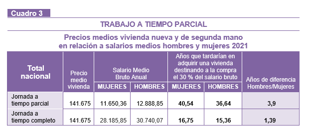 Por otra parte, trabajar a tiempo parcial dificulta el acceso a una vivienda en solitario. En España dos millones de mujeres y algo más de medio millón de hombres trabajan con este tipo de jornada laboral. Para hacer frente al precio de la vivienda, se encuentran ante una doble tesitura o viven en condiciones ínfimas o están abocadas a depender de otra persona (cuadro 3).