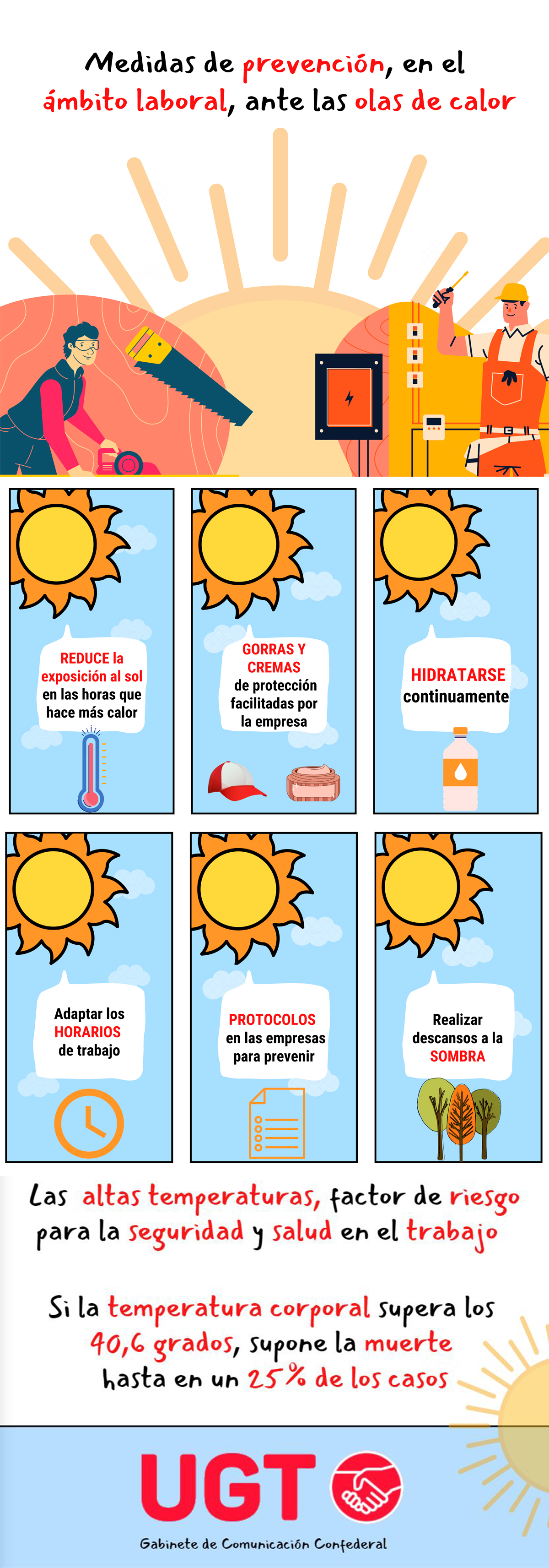 Ante esto, UGT demanda que las empresas sigan la legislación relativa a la prevención de riesgos laborales e insta al cumplimiento de la jornada intensiva de verano, si así lo tienen recogido en sus calendarios laborales o convenios colectivos. Así mismo, el sindicato subraya que los trabajadores deben ser informados sobre los riesgos existentes en sus puestos de trabajo, así como de las medidas preventivas que deben aplicarse.