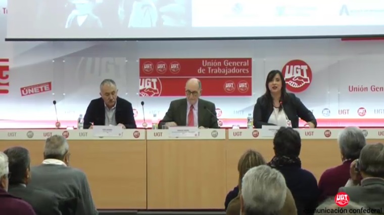El Secretario General de UGT, Pepe Álvarez, y la Vicesecretaria General del sindicato, Cristina Antoñanzas, han participado en la conferencia de Enrique Moral, profesor de la Universidad Complutense de Madrid, sobre “La huelga general de 1917 en la crisis de la Restauración”