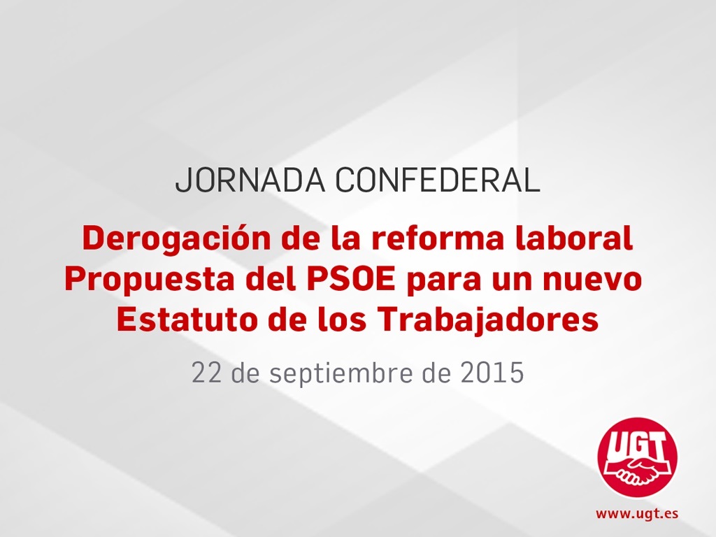 Durante su intervención en la clausura de la jornada sobre Derogación de la Reforma Laboral organizada por UGT este martes en Madrid, Méndez ha calificado las propuestas del PSOE para la elaboración de un nuevo Estatuto de los Trabajadores (ET) como "una gran operación democrática de puesta al día del ET" en la que se sale "de la trampa de hablar sólo de contratación y despido y se habla de nuevos derechos".