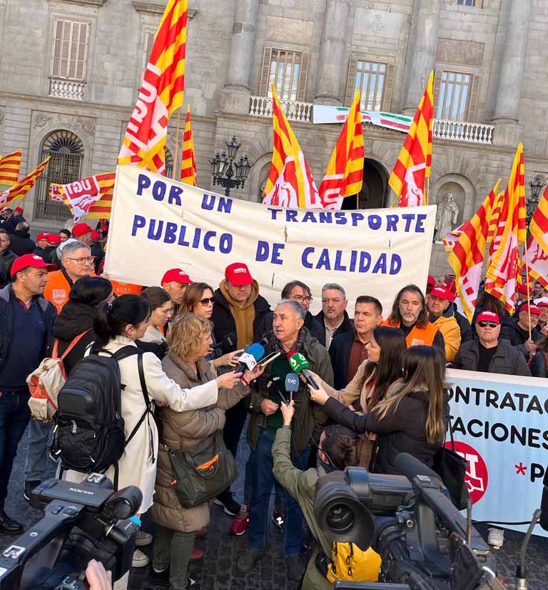 Una concentración de los trabajadoras/es de las empresas de transporte de pasajeros de la Área Metropolitana de Barcelona, que reclaman que los concursos públicos de sus servicios no cercenen derechos ni condiciones laborales a las plantillas, que acaban repercutiendo al servicio público.