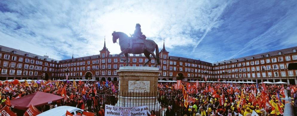 Los secretarios generales de UGT y CCOO, Pepe Álvarez y Unai Sordo, junto con las secretarias generales de UGT y CCOO en Madrid, Marina Prieto y Paloma López, han intervenido en un acto final en la Plaza Mayor donde han confluido las tres columnas de trabajadores y trabajadoras que llegaban desde Atocha, Plaza de España (calle Bailén) y Puerta de Toledo.