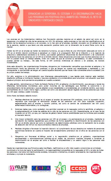 Hablar de VIH en el empleo es hablar de derechos humanos, ya que la falta de una información adecuada en torno al VIH en el ámbito laboral contribuye a perpetuar un miedo a la propagación fácil de la infección y a la vigencia de prejuicios y estereotipos asociados a la misma, que acaban generando situaciones de discriminación y de vulneración de derechos hacia las personas con el VIH en el ámbito laboral. Estas situaciones provocan que muchas personas con el VIH no puedan tener un trabajo estable, vivan con miedo de que se conozca su seroestatus, no sean contratadas o puedan perder su trabajo... De esta forma, el VIH continúa viviéndose en silencio y en soledad, de manera invisibilizada.