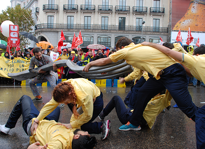 Antes de la manifestación, la compañía de Chevy Muraday Premio Nacional de Danza, ha representado un acto transgresor en el que diez bailarines con el uniforme de Correos, asediados por la empresa, lograban gracias a la unión de sus voluntades, vencer la severa agresión que en materia de empleo, salario y derechos pretende imponer la empresa postal pública.
