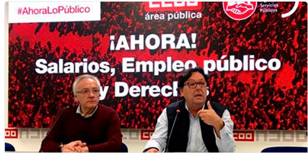 La Federación de Empleadas y Empleadas de los Servicios Públicos (FeSP) de UGT y el Área Pública de CCOO han acordado iniciar una campaña conjunta de movilizaciones bajo el lema “Ahora: salarios, empleo público y derechos”. El secretario general de FeSP-UGT, Julio Lacuerda, y el coordinador del Área Pública de CCOO, Pepe Fernández han ofrecido este martes una rueda de prensa para explicar los motivos de estas acciones encaminadas a mejorar las condiciones laborales y salariales de los empleados públicos.
