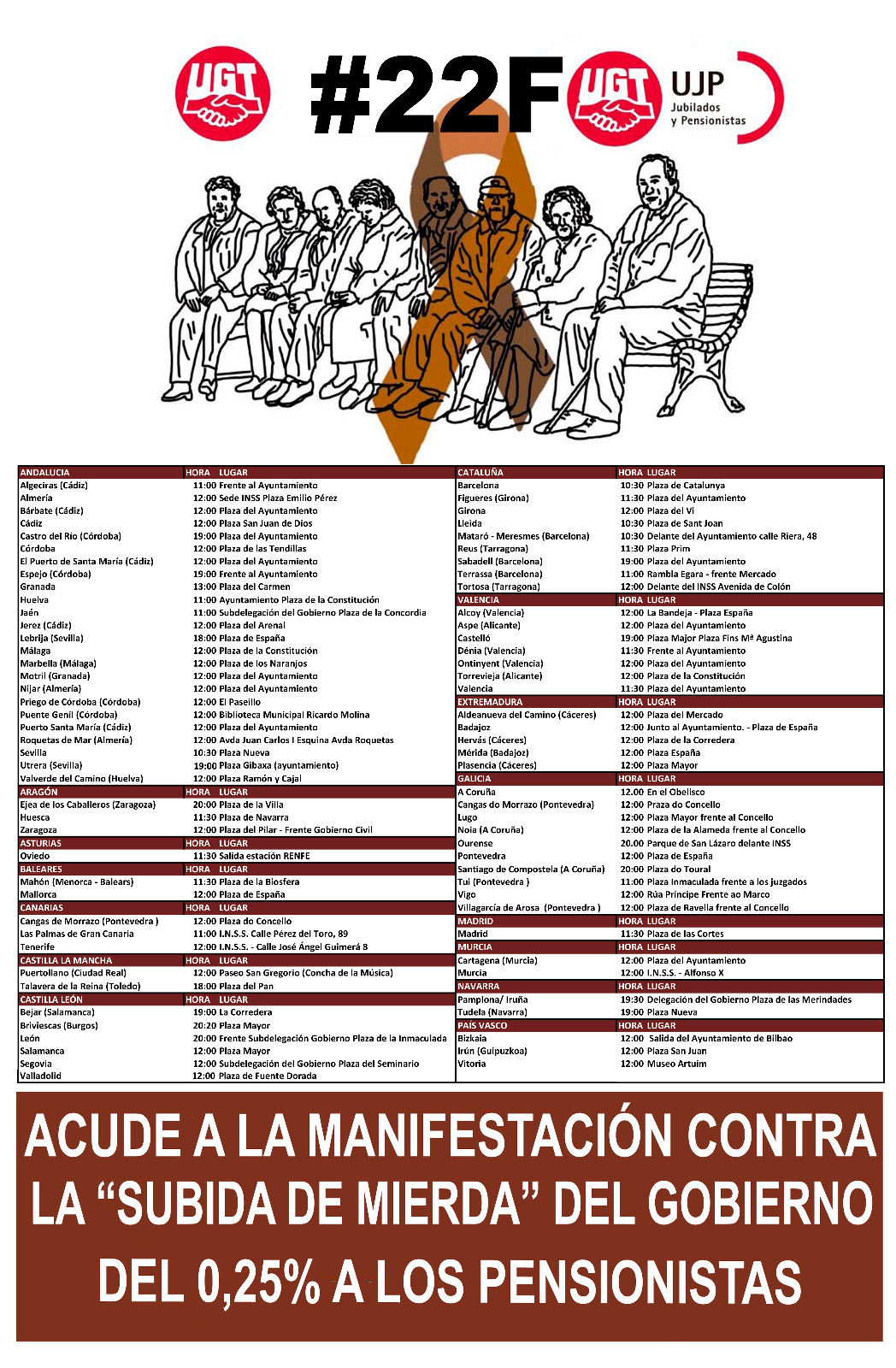 La Unión General de Trabajadores anima a los pensionistas y a la ciudadanía en general a salir a las calles hoy, 22 de febrero, en defensa de las pensiones públicas y contra la subida de mierda del 0,25% para este año.