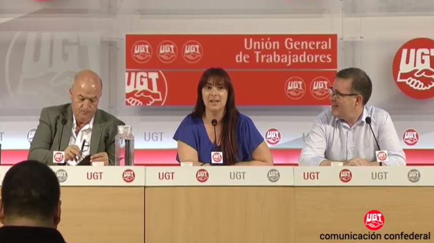 Rueda de prensa para presentar el documento definitivo del Plan Estratégico de UGT para la Corporación de RTVE, en la que han participado, la Vicesecretaria General de UGT, Cristina Antoñanzas, el Secretario General de FeSMC-UGT, Miguel Ángel Cilleros, y el Secretario General de la Sección Sindical de UGT en RTVE, Miguel Ángel Curieses. Un documento que a continuación será registrado en el Congreso de los Diputados, donde los representantes sindicales serán acompañados de representantes de distintos grupos parlamentarios