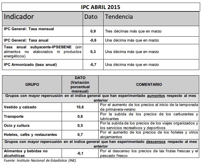 Según los datos publicados hoy por el Instituto Nacional de Estadística (INE), la evolución anual del IPC encadena su noveno mes en negativo, a pesar de que aumenta ligeramente respecto al mes anterior, y se sitúa en el -0,6%. Por su parte, la tasa mensual de la variación de los precios se sitúa en 0,9%, esto es, tres décimas por encima de la tasa mensual del mes de marzo.