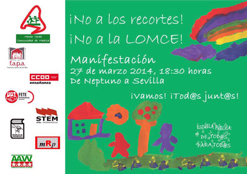 La Unión General de Trabajadores anima a la participación en la manifestación que tendrá lugar el jueves 27, a partir de las 18.30 horas desde la Plaza de Neptuno hasta Sevilla y se solidariza con la huelga de estudiantes convocadas el 26 y 27 de marzo por la Plataforma de la Escuela Pública.
