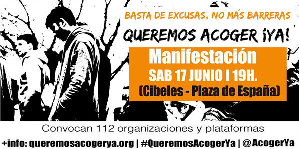 Esta movilización está convocada por más de 112 organizaciones y plataformas, se desarrolla bajo el lema “Basta de Excusas, no más barreras. Queremos Acoger ¡YA!”, y forma parte de los actos previstos con motivo del Día Mundial del Refugiado que se celebra el 20 de junio.