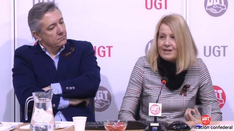 Mari Carmen Barrera, Secretaria de Políticas Sociales, Empleo y Seguridad Social de UGT, y Rafael Fernández Cañas, Director de Comunicación y jefe del Gabinete de la Secretaría General de UGT, han presentado el informe de UGT "Definición del empleo en España: Precariedad laboral, Paro estructural, Pérdida salarial y Pobreza y desigualdad"