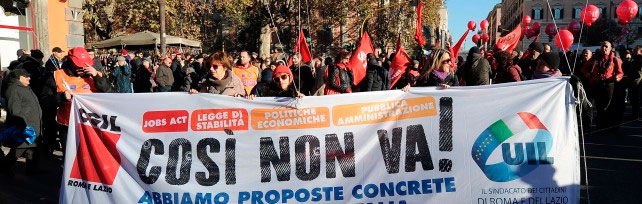 Bajo el lema “Así nos va” los sindicatos italianos piden un cambio de la reforma laboral (Jobs Act) que flexibiliza los despidos y elimina algunas de las actuales protecciones de los trabajadores. Asimismo, rechazan la reforma de la Administración y los Presupuestos austeros del Gobierno Renzi. El Ejecutivo italiano ha incumplido muchas de los compromisos adquiridos como la de no ampliar la bonificación fiscal para los jubilados.