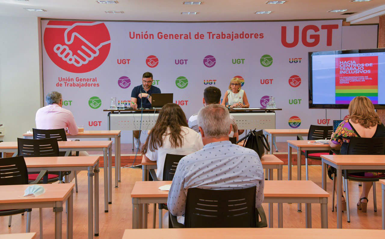 La Secretaría Confederal de UGT, Adela Carrió y el responsable Confederal del área LGTBI, Toño Abad, han presentado hoy en rueda de prensa el estudio “Hacia centros de trabajo inclusivos: la discriminación de las personas LGTBI en el ámbito laboral en España” realizado por el sindicato con la muestra de personas LGTBI más importante obtenida hasta ahora.