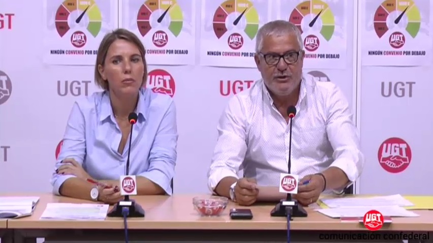 El Secretario de Política Sindical, Gonzalo Pino, y la Secretaria Ejecutiva Confederal, Isabel Araque, han presentado la campaña de UGT #PonteA1000, en la que se demanda un mínimo salarial de 1.000 euros