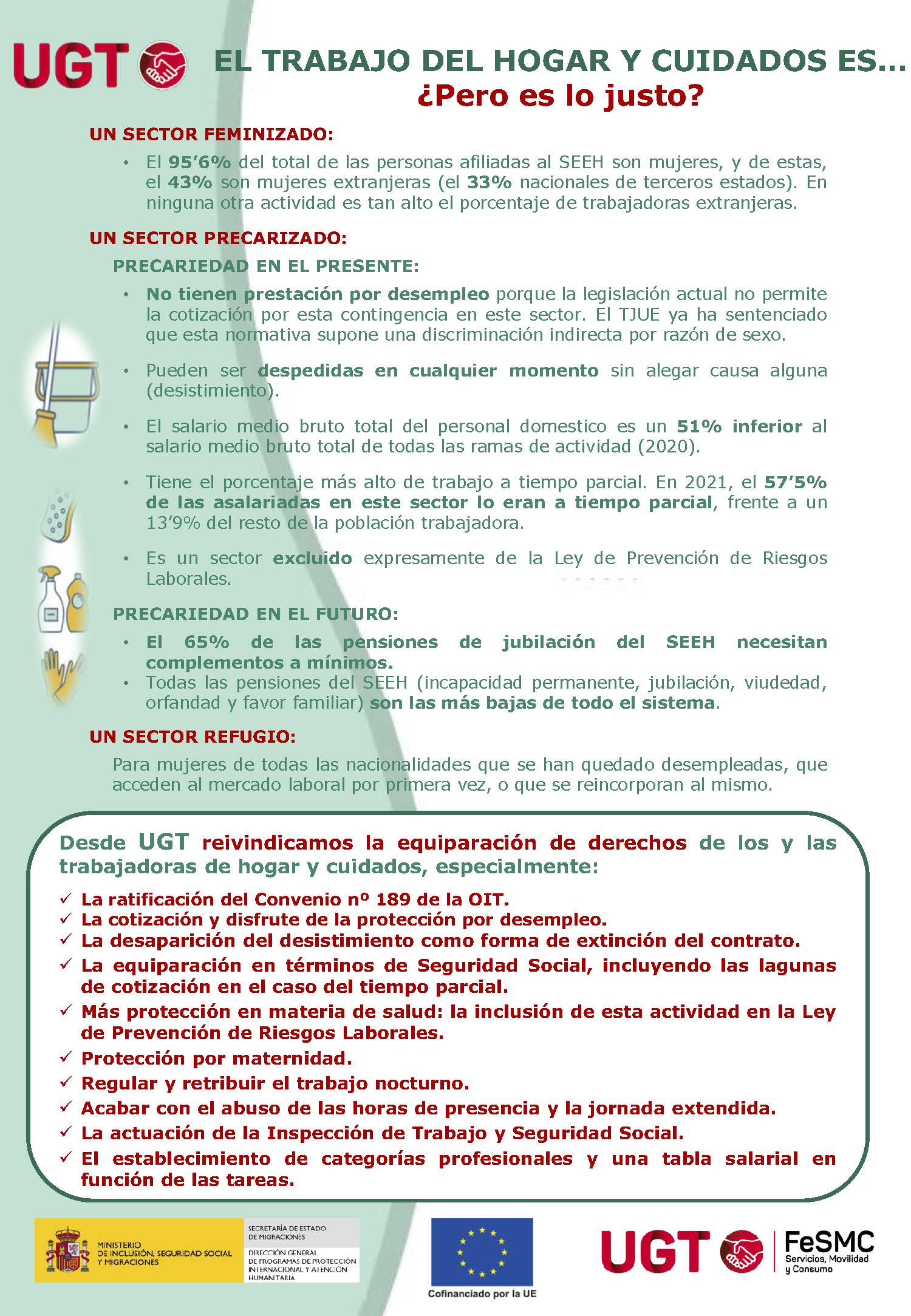 Por ello, UGT reclama la apertura de la mesa de Diálogo Social para impulsar los derechos de este colectivo y denuncia, asimismo, que la discriminación indirecta por razón de sexo que el Tribunal de Justicia de la Unión Europea dictaminó que existe en el caso de la prestación desempleo, se extiende a otros aspectos de la regulación de este trabajo.
