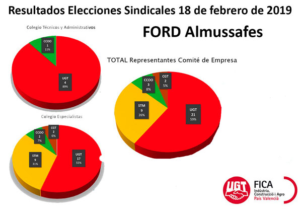 La Federación de Industria, Construcción y Agro de UGT ha vuelto ganar de forma aplastante las elecciones sindicales celebradas ayer en FORD con una amplia mayoría absoluta de 21 delegados de los 35 que se elegían. El resto de delegados se han repartido entre STM (9), CCOO (3) y CGT (2).