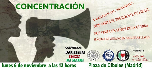 Hoy, a las 12, se celebra una concentración en la Plaza de Cibeles para rechazar la entrega de las llaves de oro de Madrid, al presidente de Israel, Reuven Rivlin.