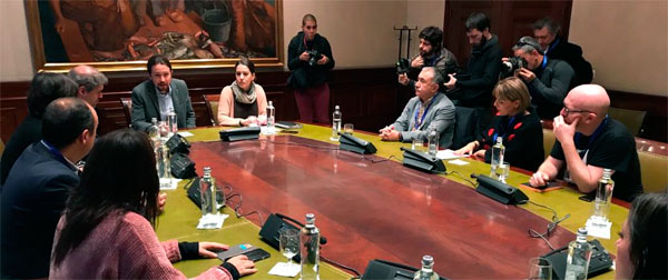 Delegaciones de UGT y CCOO, encabezadas por sus Secretarios Generales, Pepe Álvarez y Unai Sordo, se han reunido en la mañana de hoy con una de Podemos, encabezada por su Secretario General, Pablo Iglesias, para analizar la situación actual en materia económica y social.