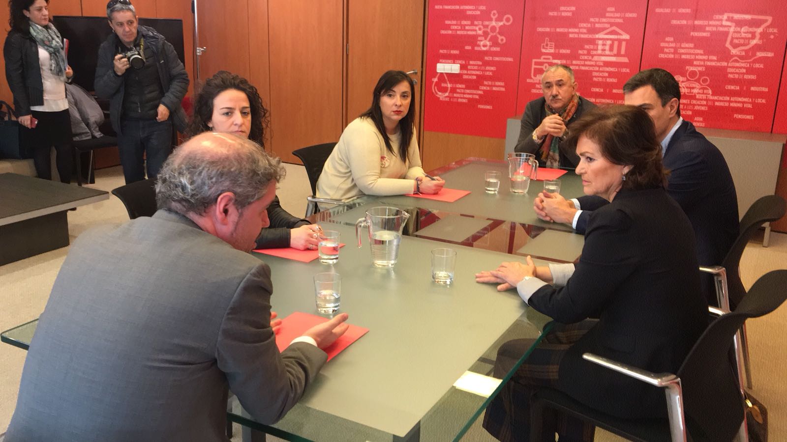 Los Secretarios Generales de UGT y CCOO, Pepe Álvarez y Unai Sordo, junto con la Vicesecretaria General de UGT, Cristina Antoñanzas, y la Secretaria de Mujeres e Igualdad de CCOO, han recibido el apoyo del PSOE a los paros laborales de dos horas convocados por ambos sindicatos para el 8 de marzo, con motivo del Día Internacional de la Mujer, en una reunión mantenida esta mañana con el secretario general del partido, Pedro Sánchez, y la secretaria de Igualdad, Carmen Calvo.